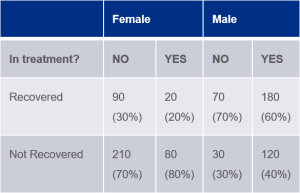 Let’s try putting this into an example. Say there is a new treatment being tested on a group of 400 men and 400 women[1]. Half of the cohort are in the treatment group, half are in the control group, and they are assigned to either group at random. Results show that 50% of those in treatment recovered compared to 40% in the control group. Does this mean the treatment has a positive effect? Not necessarily…