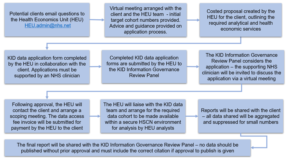 A governance structure is in place to manage access to the KID and any project requiring access must have an NHS clinician as a principal investigator. There are fees for access, which contributes to the maintenance and further development of the KID.